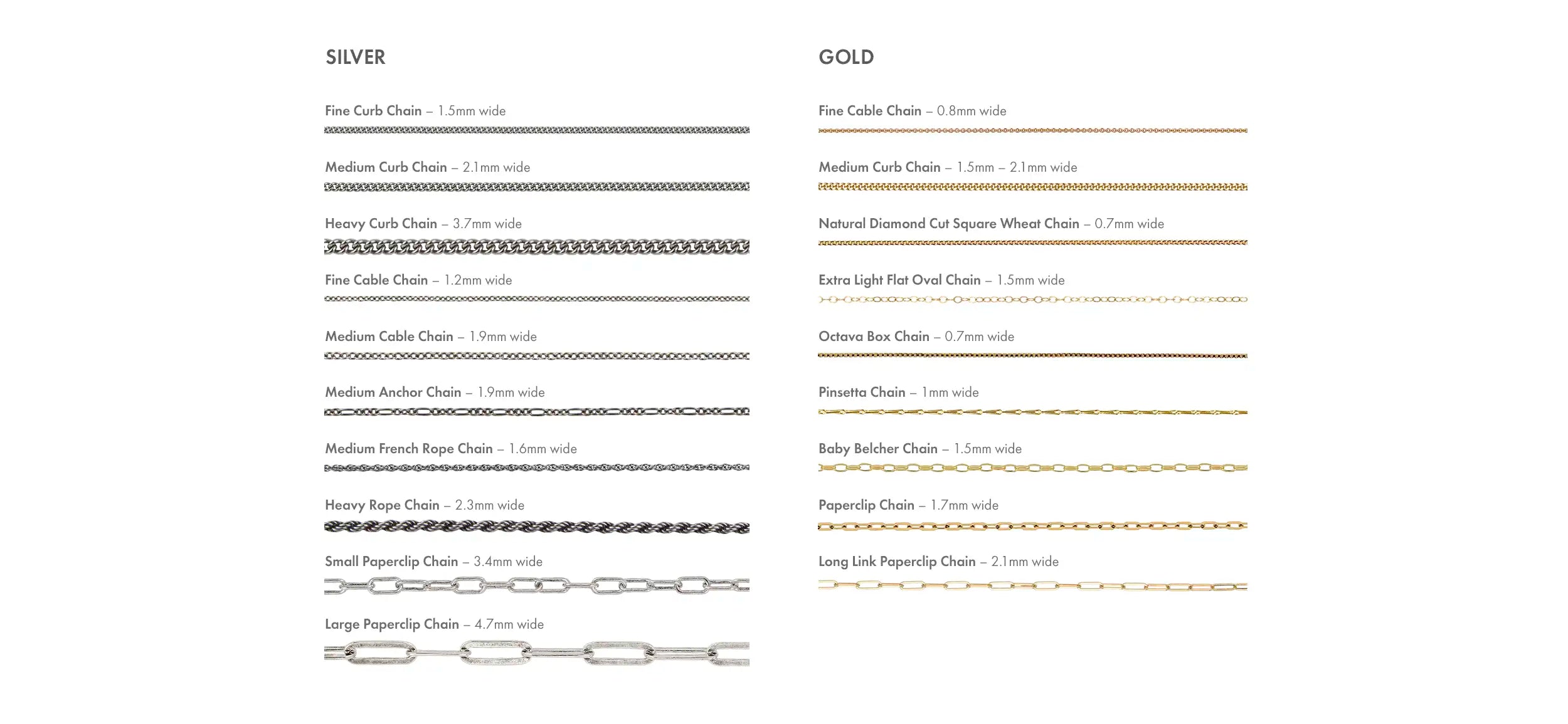The easiest and best way to determine the right chain length for you is to measure using a soft piece of string. Simply loop the string around your neck allowing it to hang to where you feel it’s best. Cut the string at that point, lay it flat and measure it.