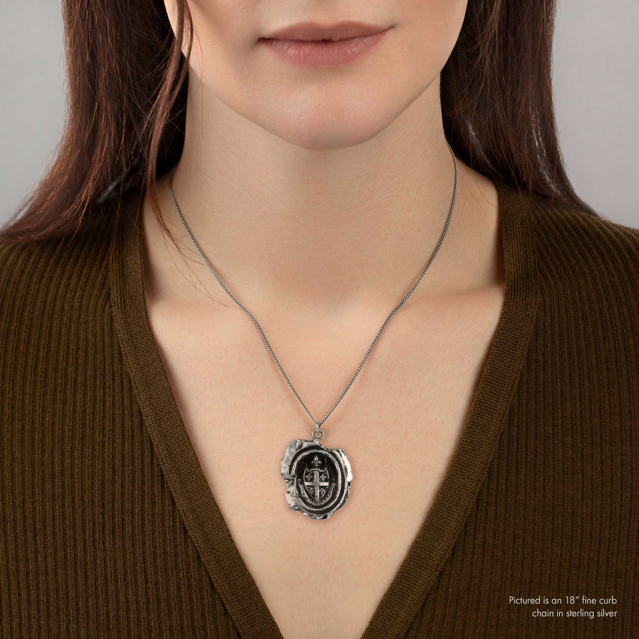 This talisman reads 'Virtus Sibi Premium' in Latin, meaning 'Virtue is its own Reward.' The fleur de lys is symbolic of light and life.