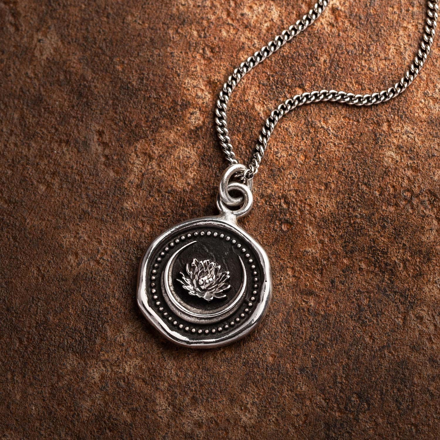 The lotus flower, which blooms from the depths of murky waters, represents resilience and the ability to overcome obstacles. Paired with a crescent moon, it is symbolic of new beginnings.